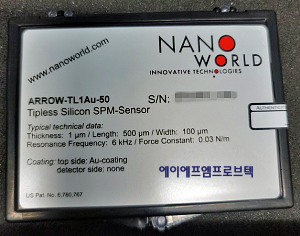 ARROW-TL1Au-50 [C = 0.03 N/m; fo = 6.0 kHz] Tipless AFM cantilever, single AFM cantilever beam on single crystal silicon holder chip sample facing side: gold coating based on Arrow¢â technology