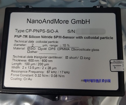 CP-PNP-SiO Colloidal AFM probe, AFM cantilever with round AFM tip like a ball Manufacturer: sQube Coating: Reflective Gold AFM tip shape: Sphere, Silicon Dioxide Sphere Diameter: 1.98 - 14.45 µm Sphere diameter A = 2 ¥ìm, B = 3,5¥ìm, or C = 6,62 ¥ìm (all +/- 5%) Please choose A, B, or C by ordering! This probe features 2 cantilevers F 67 kHz C 0.32 N/m L 100 µm F 17 kHz C 0.08 N/m L 200 µm